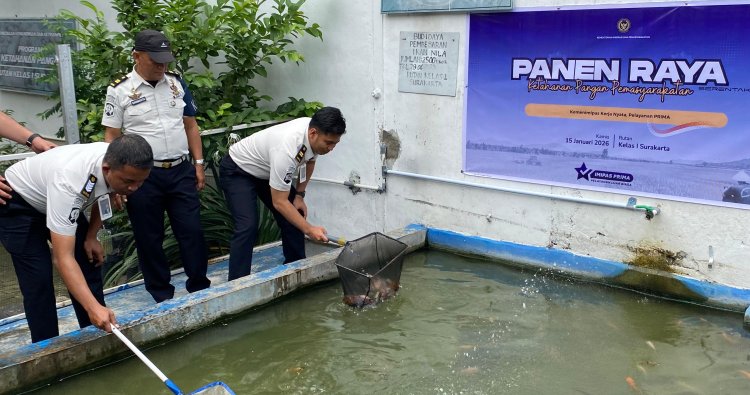 Dalam kegiatan tersebut, Rumah Tahanan Negara Kelas I Surakarta melaksanakan panen hasil budidaya perikanan berupa ikan nila dan ikan lele yang dikembangkan di area rutan, Kamis (15/01). Panen raya ini diikuti oleh seluruh pejabat struktural Rutan Surakarta yang didampingi oleh staf penanggung jawab ketahanan pangan, sebagai bentuk dukungan nyata dan keterlibatan langsung pimpinan serta jajaran dalam menyukseskan program tersebut.